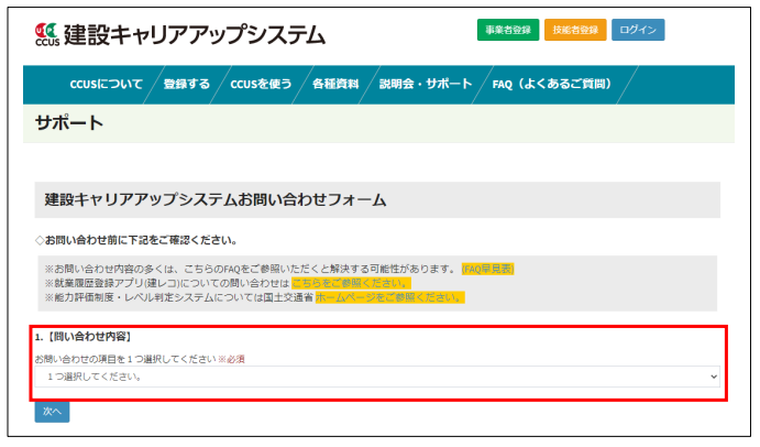 まず、キャリアアップシステムのお問い合わせホームに進んでいただき、